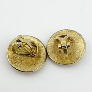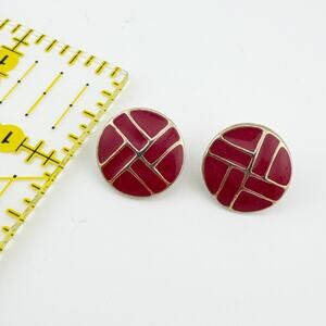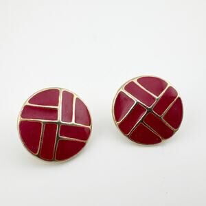 vintage earrings, enamel earrings, red clip-on earrings, mid-century modern, geometric earrings, retro jewelry, statement earrings, gold tone, round earrings, collectible earrings, costume jewelry, classic earrings, art deco, vintage fashion accessories