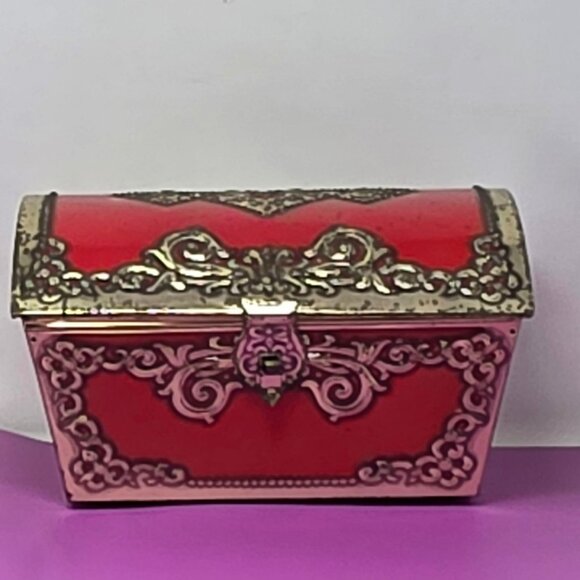 This ornate tin box combines decorative artistry with functional storage. Crafted in red and gold metal, it features intricate scrollwork and a hinged lid for secure access.