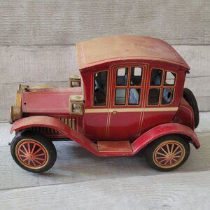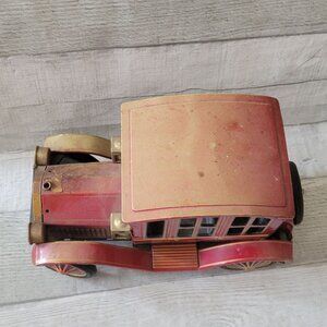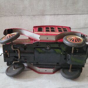This collectible vintage tin litho wind-up car model showcases intricate detailing in red and gold tones. A charming addition for vintage enthusiasts.