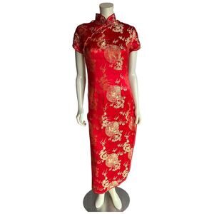 Absolutely stunning authentic Chinese cheongsam dress by Golden Dragon that will make you feel like absolute royalty! This gorgeous red brocade qipao features the most intricate gold embroidered dragon and phoenix motifs dancing across the entire garment, symbolizing perfect harmony and good fortune. The luxurious fabric has that beautiful sheen and drapes elegantly with a fitted silhouette and modest side slit. Traditional mandarin collar with frog button closures adds authentic detail, while cap sleeves keep the look classic and timeless. Made in China with quality craftsmanship throughout. Approximately size 6 or small, shown on a size 6 dress form for reference. There is one small pea sized black dot on the side panel between the zipper and back dart as shown. Otherwise this piece is in excellent vintage condition! Perfect for Lunar New Year celebrations, weddings, formal events, cultural festivals, or anyone who collects authentic Asian garments and traditional fashion!