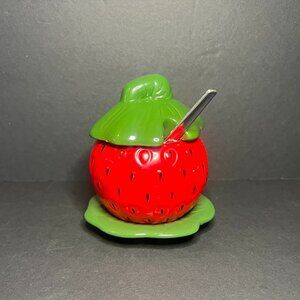Vintage Red & Green Strawberry Ceramic Sugar Bowl Jar w/ Sheffield Spoon 4.5"