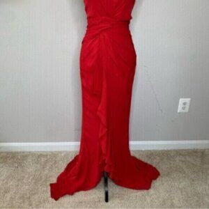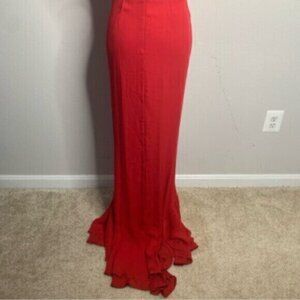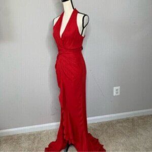Vintage Red Halter Plunged Neckline Gown with Elegant Ruffle Detail