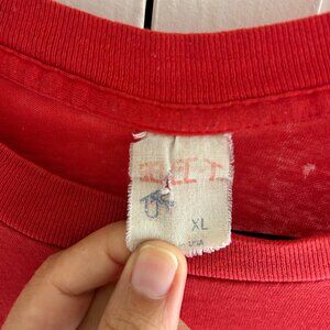 Vintage island vibes with this rad red short-sleeve t-shirt and white "Hang Loose...Kauai" Hawaiian shaka graphic. In used condition- super soft but a few small holes as pictured. Sz XL