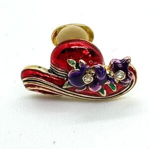 Vintage Red Hat Society Ladies Enamel Clip On Earrings Gold Metal Purple Flowers
