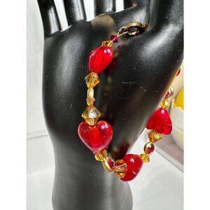 Vintage Red Heart & Amber Beaded Bracelet With Gold-Tone Accents 7 Inches Womens