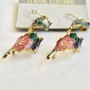 Vintage Red Hibiscus Flower Cloisonne Earrings Enamel Dangle Gold Tone Taiwan
