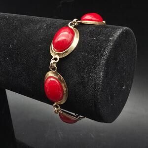 Vintage Red Jade Gold Tone Bracelet Oval Links Costume Jewelry