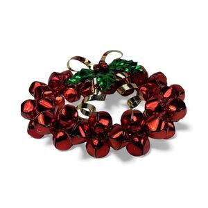 Festive red jingle bell wreath makes delightful rings every time you open the door. All metal including the gold ribbons and holly leaves. Approximately 10. In very good condition with minimum wear and no rust.