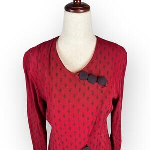 Vintage 1970s Red and Black Kimono Style Patterned Long Sleeve Shirt with Black Button Detail. Form Fitting Elegant Eclectic Sophisticated Blouse with Slim Narrow Waist Silhouette and Dainty Details.
