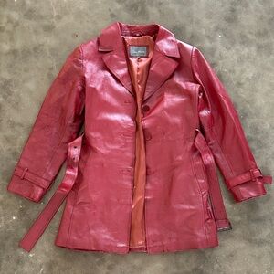 Amazing red leather trench coat style jacket with belt. Has sort of a metallic sheen. Vintage circa 1970’s. Some signs of wear consistent with age but great vintage condition. Satin lining has a few stains (pictured).