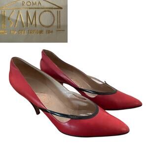 vintage heels, red pumps, SAMO Roma, Italy shoes, 80s fashion, retro heels, leather heels, black trim, pointed toe, mod shoes, stiletto, made in Italy, high heel, Euro chic, Roma shoes, estate shoes, red shoes, vintage glam, retro fashion, dress shoes