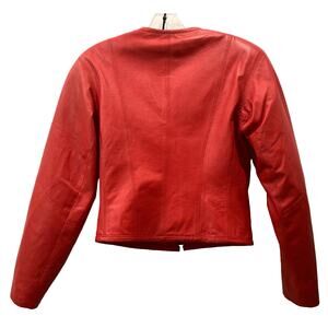 Late 80s / early 90s red leather cropped jacket by CHIA, made in Korea and tagged size Small. Features a striking collarless design, strong silhouette with shoulder pads, and vivid cherry red color. Fully lined in red nylon. This piece brings sleek power dressing to any outfit — from Y2K revivalists to classic vintage lovers.