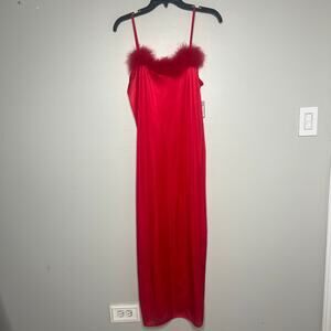 Vintage Red Lingerie Long Nightgown Feather Trim Size Small Side Slit Sexy USA