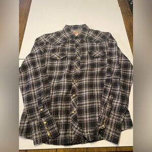 Vintage red black and white long sleeve flannel with gold embellishments on sleeves super soft cotton
