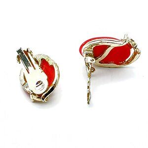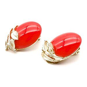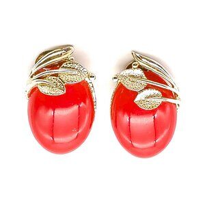 Vintage Red Lucite Earrings with Gold Tone Leaves Overlay, Dimensional Clip Ons
