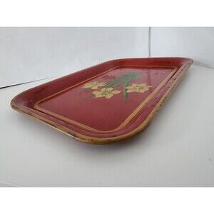 1950s with this vintage red metal tray - mustard yellow daffodil pattern and green leaf background - measures 14" x 9" - original piece from the 1950-1959 era - shows wear for age - paint has rubbed off bottom and sporadically throughout - SEE PHOTOS FOR DETAILED DESCRIPTION AND CONDITION. AS IS.