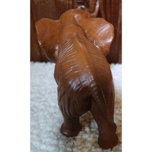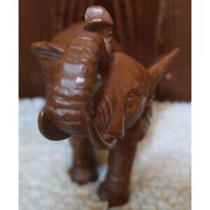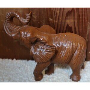 This vintage Red Mill Manufacturing elephant statue is a beautiful addition to any collection. Handcrafted in the USA with wood and pecan shells, this small statue stands at 5 inches tall and 6.5 inches long. The intricate carvings and lifelike features make it perfect for animal and sculpture enthusiasts alike.