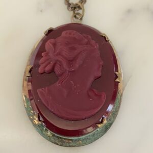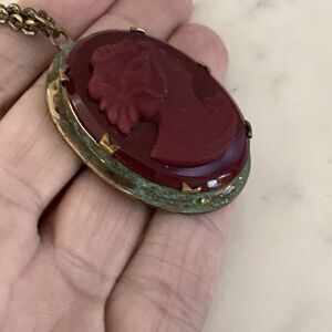 Vintage Red Molded Glass Cameo Golden Frame Patina Necklace Pendant