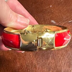 Vintage Red Pink Flower Enamel Hinged Bangle Bracelet with safety chain