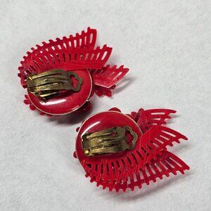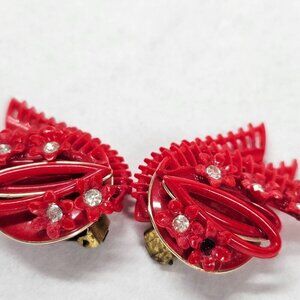 Tags: Vintage earrings, red clip-ons, plastic jewelry, rhinestone earrings, quirky accessories, retro earrings, unique gifts, fashion jewelry, statement earrings, red accessories, old-school style, 1950s earrings, velvet pouch