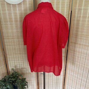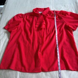 This vintage blouse offers a timeless style with its vibrant red polka dot design. Featuring a ruffle tie neck and puff sleeves, it makes a charming addition to any vintage-inspired wardrobe. Lightweight and breathable, ideal for both casual and semi-formal occasions.