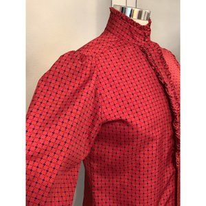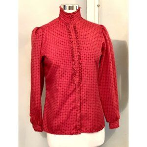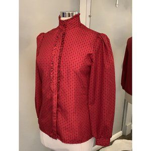 Vintage :: Red Polka Dot Secretary Blouse Size M Puffy Sleeve High Neck Ruffles