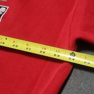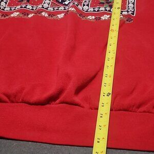 A classic red sweatshirt featuring a folk art-inspired design with houses, trees, and hearts surrounded by floral patterns. The soft fabric ensures comfort, while the vibrant design adds charm. Note: visible wear and tear on the collar area.