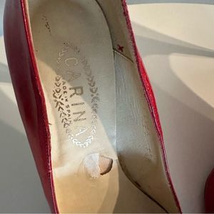 Vintage Carina Red Heels With Bows, Gold Elements, Embossed Leather, Two Inch Heel, Size 7, Being From The 1980’s These Heels Do Show Wear, But Still Have A lot Of Life Left And Would Make A Great Statement Piece, Made In Spain, Measures Approximately 10”, May Run Small So Double Check