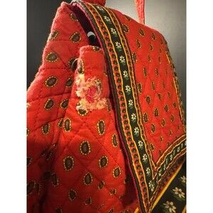 Vintage Red Quilted Cotton Backpack Purse Folk Floral Drawstring Tote Bag 13"