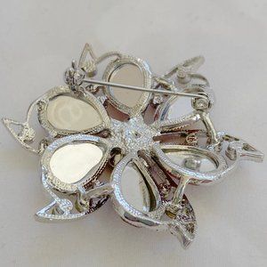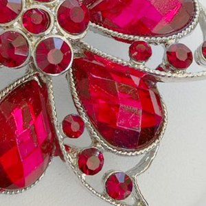 Statement brooch with LOTS of sparkle! It features a layered flower/pinwheel design consisting of 3 large teardrop red rhinestones accented by smaller round-cut rhinestones with 5 stones in the center. It’s a gorgeous piece – perfect for the holidays or any time with a special jacket, blouse, sweater or scarf.