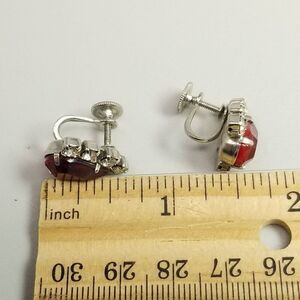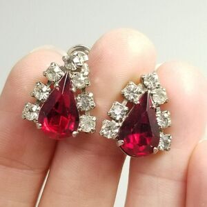 Vintage Red Rhinestone Teardrop Shape Clip On Earrings, Prong Set Silver Tone