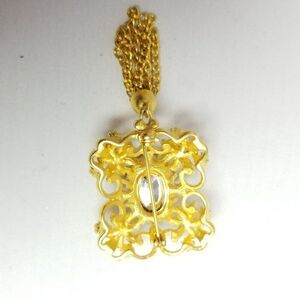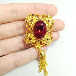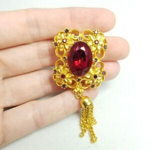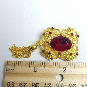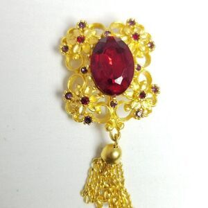 Vintage Red Rhinestone and Gold Tone Brooch, Tassel Lapel Pin, Estate