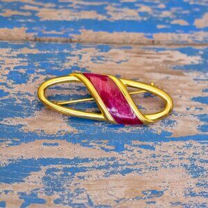 Vintage Red Ribbon Round Oval Gold Tone Brooch