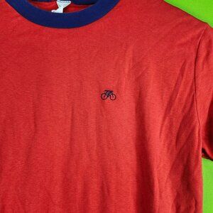 Vintage Red Ringer T-Shirt With Embroidered Bicycle Design Navy Accents Size L