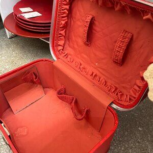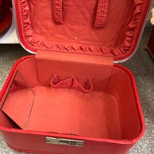 Vintage 1960s Samsonite red train case. Used for cosmetics or as a carry on bag. Mirror no longer glued in. Pocketed red lining inside. 10" tall including handle, 9" across, 11" length. In pretty good shape. Still definitely usable. Known for hard shell design. Made of vinyl.
