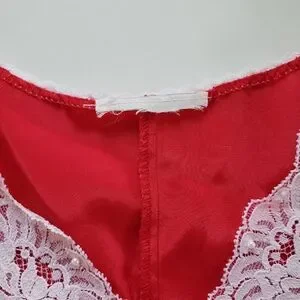 Details: red satin with white lace trim/collar. Rosette in middle. Lace has small white "pearl" beads. NO STRETCH