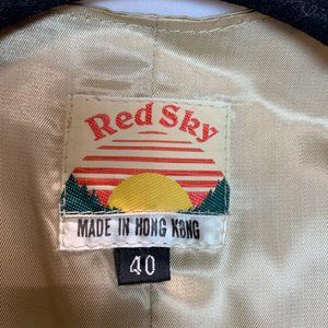 Great vintage vest by Red Sky. Size 40. Front is 100 % leather (suede). Back is rayon. Dry Clean only. Made in Hong Kong. Average condition - some wear to the suede.