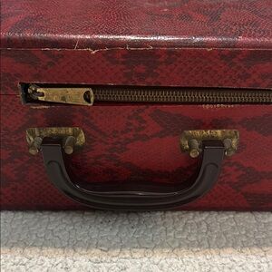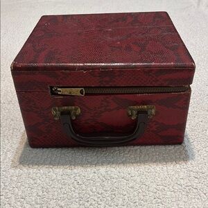 Elegant red snakeskin box. This item is a retro music case or storage box from the mid-century era, possibly dating back to the 1950s or 1960s. It features a faux leather covering with an alligator or snakeskin print.