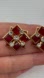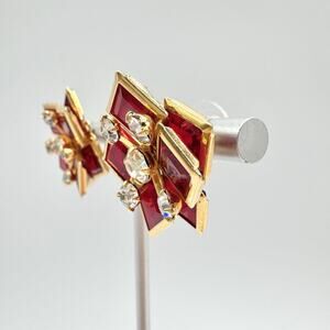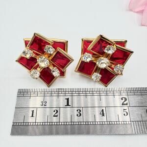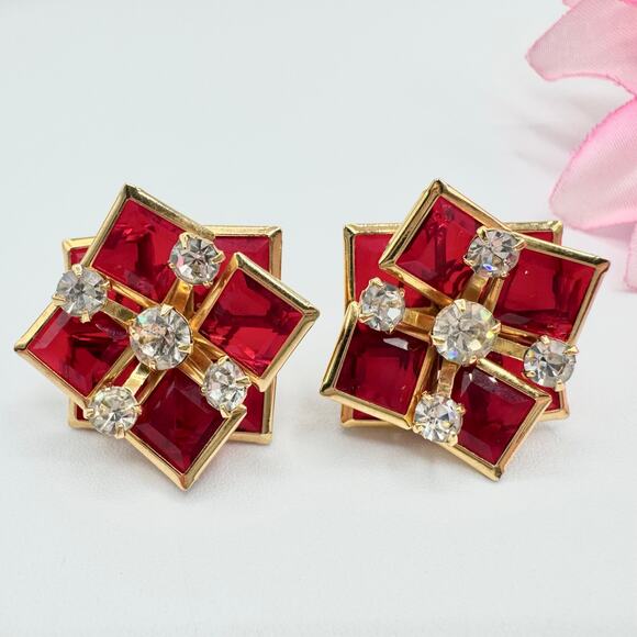 Vintage Red Square Crystal Dimensional Bezel Set Layered Cluster Earrings