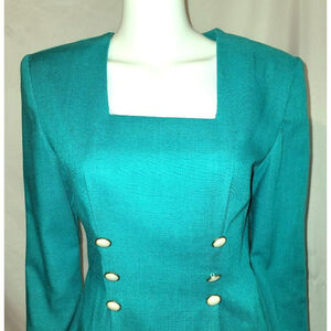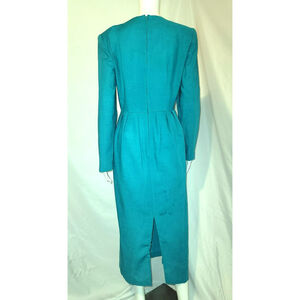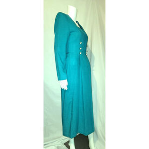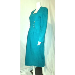 Very classy, very beautiful Red Star long sleeve dress from the 80's. Gorgeous teal color with two rows of three "pearl" and gold tone buttons on the front. Pintucked at the waist to show off your curves. Square neckline for your jewelry to shine. Mid length, padded shoulders. 15" kick pleat in the back for walking ease.