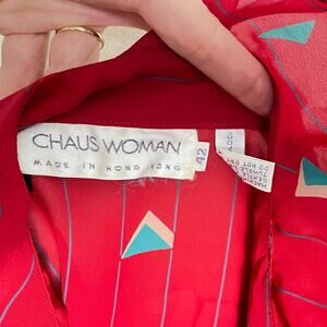 Vintage Red Teal Geometric Print Ruffle Sheer Long Sleeve Gathered Shoulder Top