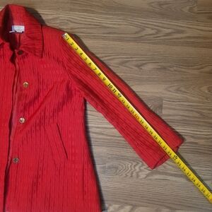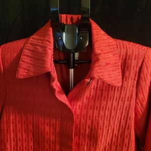 Stylish vintage jacket with a textured pattern. Features a classic collar and buttoned cuffs. Perfect for adding a pop of color to any outfit.