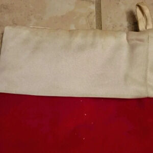 This is a super cute handmade Christmas stocking. It has a tree and candle made out of sequins and a snowman made out of beads. The is a velour velvet type of material. The top of stocking is a satin type of material. The white stain does have a little yellowing..