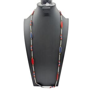 Vintage Red White Blue Multi Shape Long Acrylic Beaded Necklace