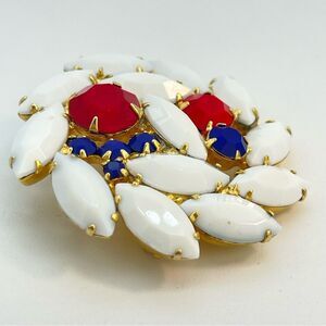Vintage Red White & Blue Opaque Rhinestone Brooch | Prong Set, Gold Tone, Round