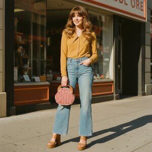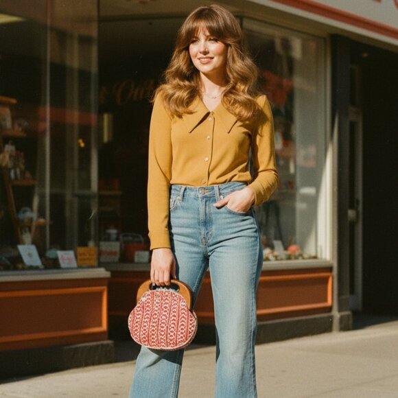 Vintage 70s red and white embroidered, three pocket clutch. Small. Fits phone. Wooden handle. Photo with model is computer generated.