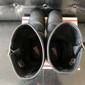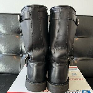 Vintage Red Wing 988 engineer boots in black leather. Made in USA with steel safety toe protection, classic pull-on engineer design, and adjustable top/buckle straps. Built with Goodyear welt construction and oil-resistant soles for durability.