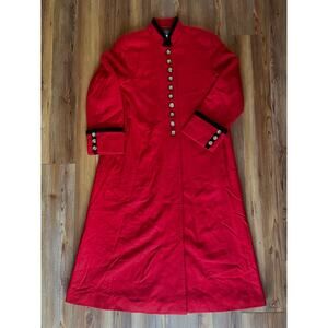 Harvé Benard vintage red wool coat. Button up closure with collar. Button details at sleeve and has 2 deep pockets. Wool and lining in great shape! Some fading at end of sleeves/trim (seen in pics). A-line silhouette. Size 10 women’s. Sleeve measures 24.5” from shoulder, chest measures 42” around, length is 50” from shoulder.