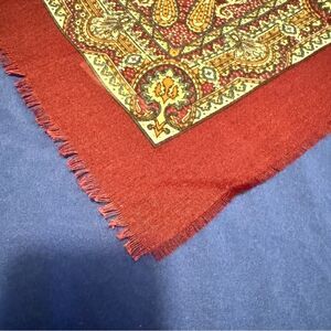 Stylish scarf featuring a paisley pattern in red and gold. Never used.