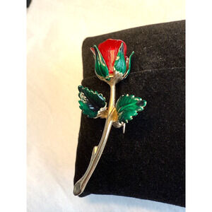 Vintage Red and Green Enamel Long Rose Stem on Gold-Tone Brooch Pin Floral
